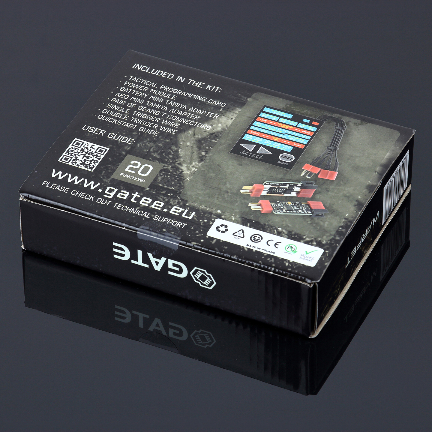 Dzięki funkcjom Pre-cocking i Inteligentny Spust, osiągniesz reakcję spustu niemal identyczną jak w broni palnej. Programowalny Burst pozwoli Ci na jednoczesne wystrzelenie wcześniej ustalonej liczby kulek (1-5 strzałów), co jest bardzo przydatne w MILSLIM’ach i magazynkach low-cap. Kolejną świetną funkcją jest Regulacja Szybkostrzelności, która pozwala zredukować szybkostrzelność Twojej repliki, tak, że będziesz w stanie używać mocnych akumulatorów LiPo i mimo tego wciąż mieć ROF jak w prawdziwej broni. Jeśli natomiast Twoja replika się zatnie, Inteligentny Bezpiecznik ochroni baterię i silnik przed uszkodzeniem. Chroni on również akumulator przed nadmiernym rozładowaniem. Ponadto dzięki WARFET zyskujesz: MOSFET, Aktywny Hamulec ON/OFF, Wbudowane Auto-testowanie, Debouncing i wiele więcej. Dużo ciekawych funkcji, świetne parametry elektryczne, i powłoka ochronna (specyfikacja MILITARNA: MIL-V-173C) sprawiają, że ten system kontroli repliki sprosta wymaganiom najbardziej doświadczonych graczy airsoftu.