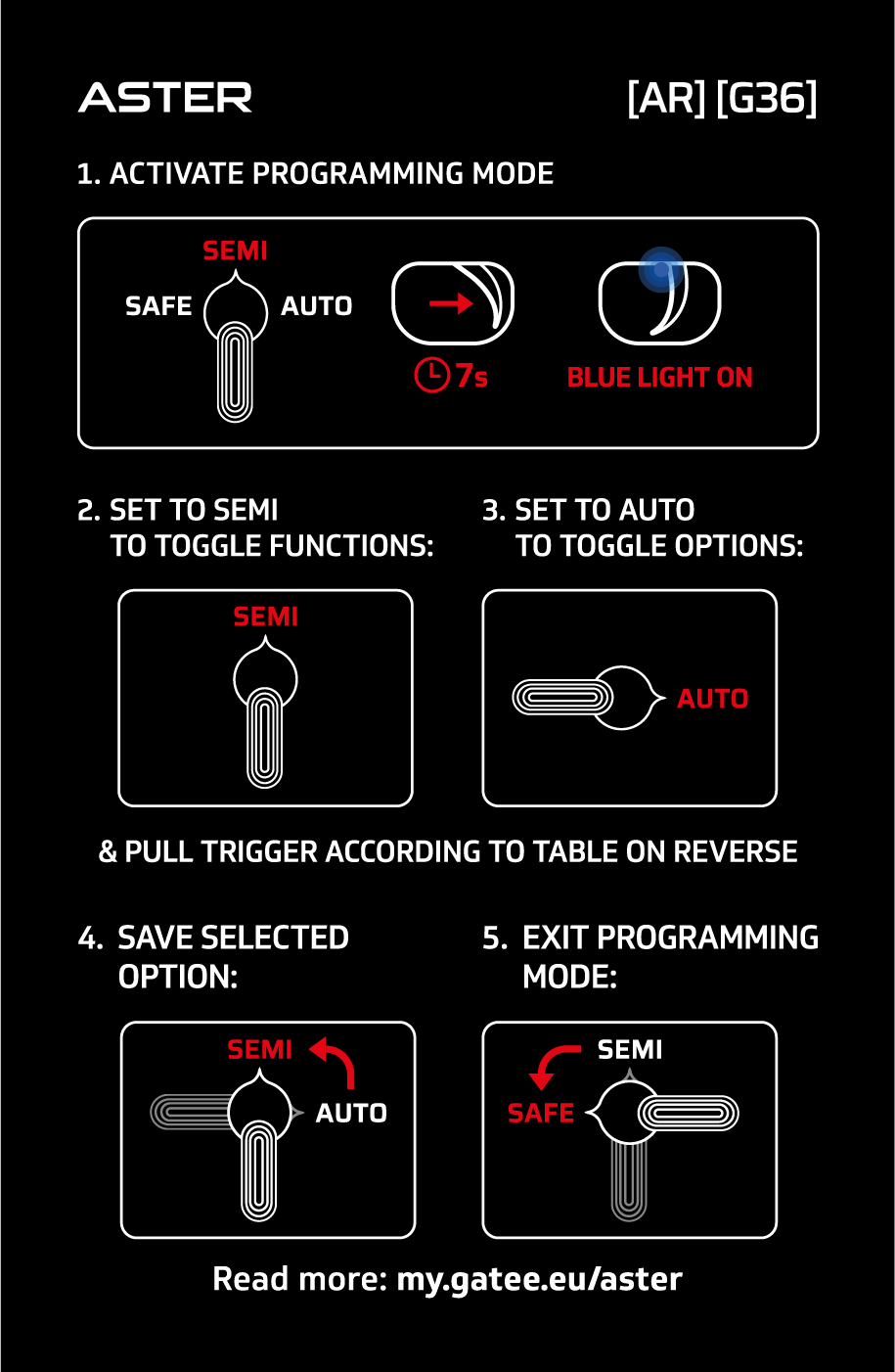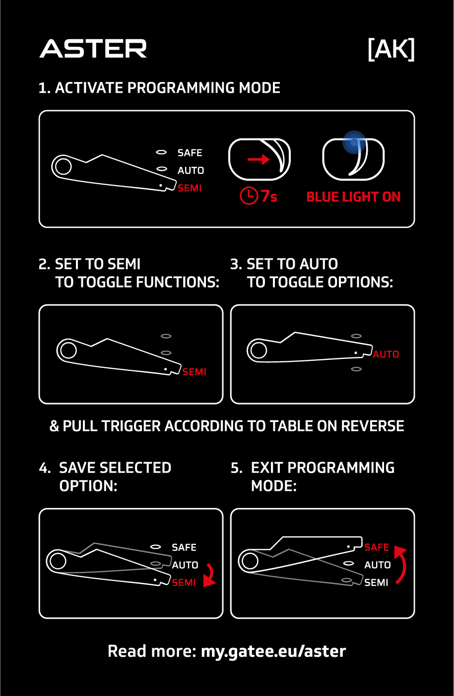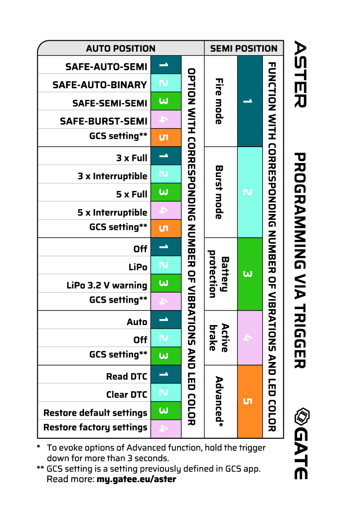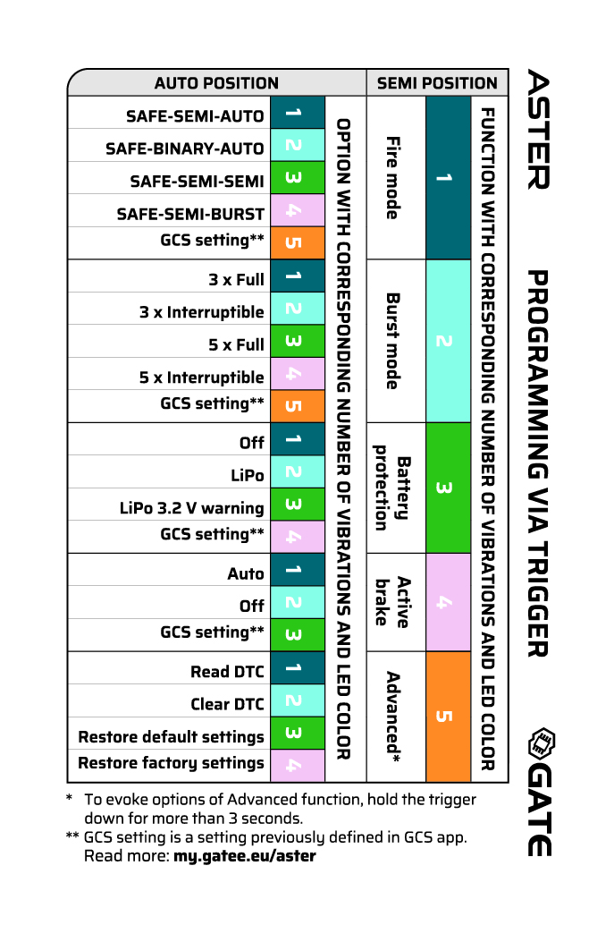 This programming mode allows you to configure basic functions of ASTER only with trigger and fire selector. During programming, functions and options are indicated by corresponding LED colors and vibrations.