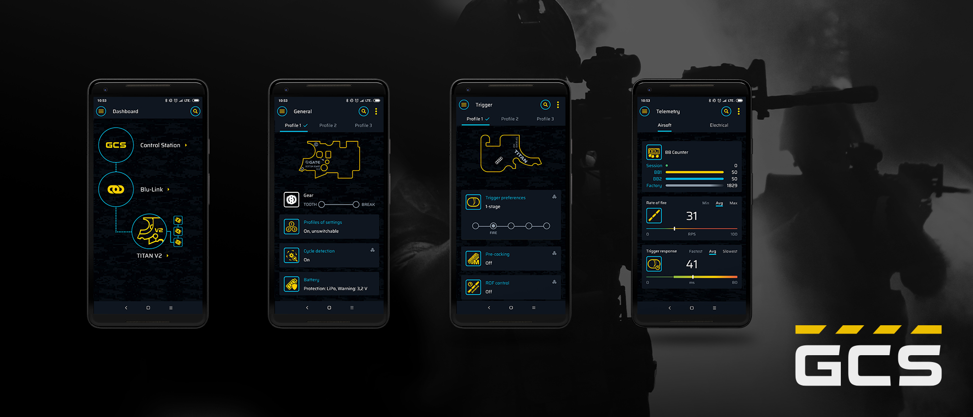 GATE Control Station is a free universal app for configuring, controlling, and connecting the GATE Ecosystem elements such as the TITAN and ASTER Electronic Trigger Units or the tactical computer STATUS. The app is compatible with Android, iOS, Windows, and macOS devices. To connect with the GATE Control Station App, use Blu-Link or USB-Link and the corresponding device. Check the list of compatible devices below.